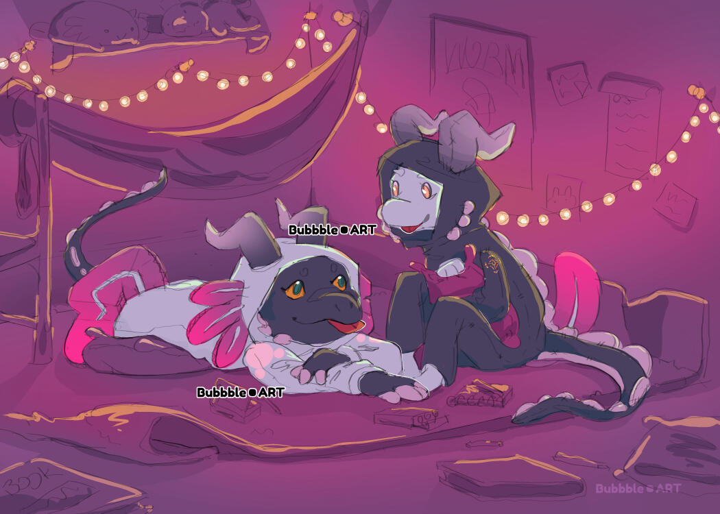 These assets were created in collaboration with fellow illustrator Blqgumi for the Make Visual Novel Assets!! Jam 2026!Blqgumi provided vision and direction for the assets, choosing an 80's anime visual style. They provided two background sketches, which I rendered with watercolor-esque texture and whimsical color. Additionally, I was put in charge of making two simple CG's of the main characters. Working off of Blqgumi's character design and needs, I sketched and rendered the CGs to completion.Asset Pack Itch.io Page