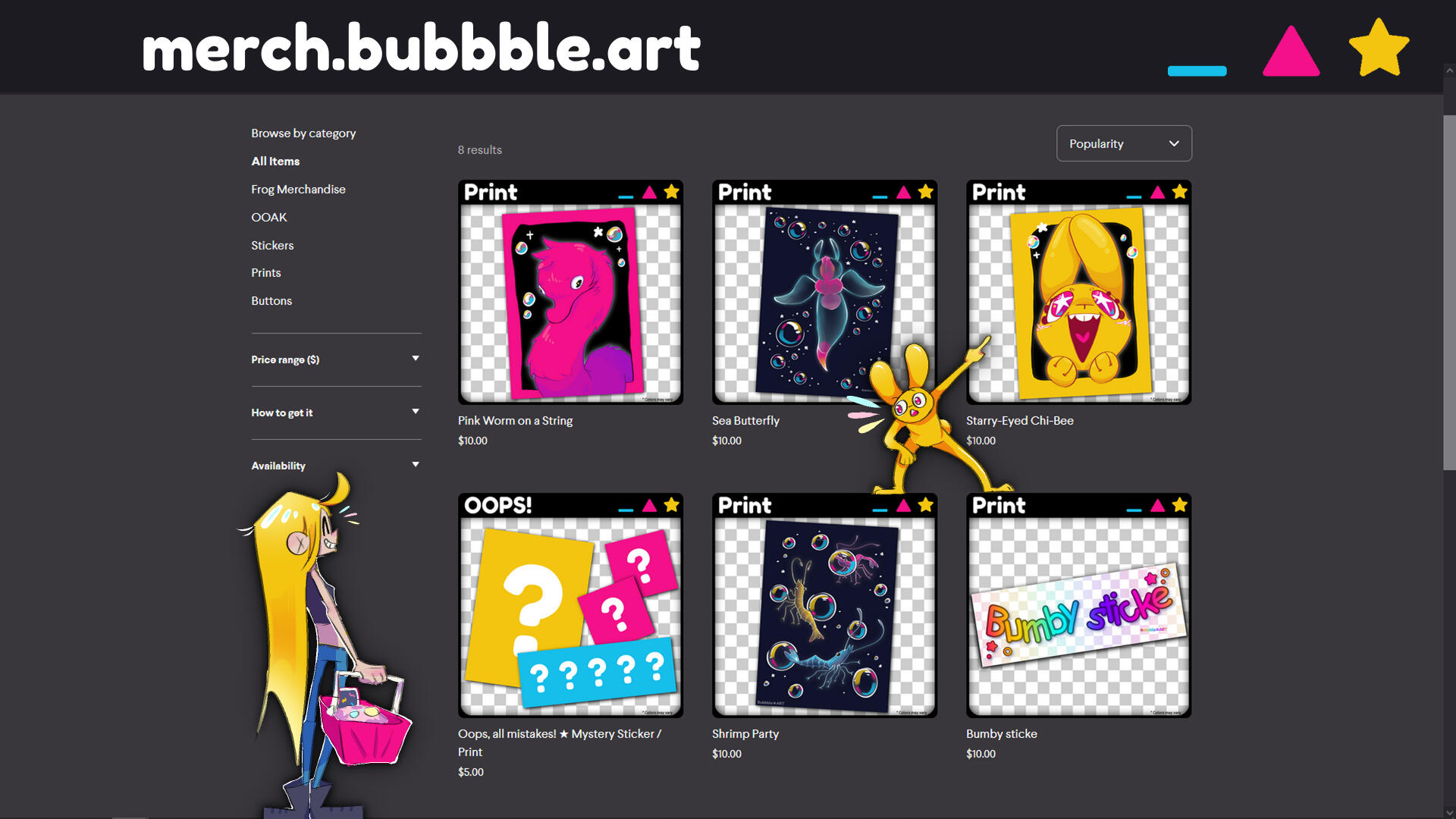Merchandise design is my favorite art form, and merch.bubbble.art is the lovingly crafted colorful wrapper containing plentiful prismatic goodies. The storefront I use permits very little customization, which forces me to be creative with the presentation of the items themselves. This constraint inspires, not restricts. Playing off the very window you're presently peering into, the impeccable, whimsical sense of graphic design and narrative voice unites the diverse, lovingly crafted subjects of merch.bubbble.art.Check out the store first-hand!